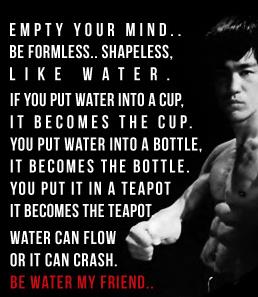 At Work, Be Like Water "You must be shapeless, formless, like water When you pour water in a cup, it becomes the cup When you pour water in a bottle, it becomes the bottle When you pour water in a teapot, it becomes the teapot Water can drip and it can crash Become like water my friend" What I like about this quote from Bruce Lee"Empty your mind Be formless, shapeless, like water Be water, my friend" The famous quote from martial arts star Bruce Lee has taken on a new life as a slogan of the Hong Kong protestors